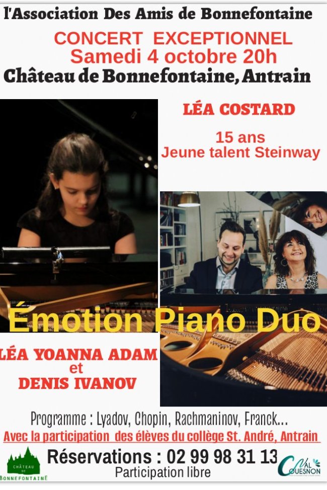 Au programme : des œuvres de Lyadov, Chopin, Rachmaninov, Franck,… interprétées par Léa Costard, 15 ans, jeune talent Steinway, au piano ainsi que Léa Yoanna Adam et Denis Ivanov en duo au piano.