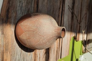 Elle utilise aussi d’autres techniques (textile, vannerie) pour compléter ses poteries et créer son propre univers narratif.
