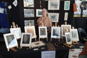 Après avoir éduqué mes enfants, j’ai repris à plein temps la gravure sur cuivre. C’est une technique de taille douce en creux sur le métal, soit avec des outils, comme burin, pointes sèches. Je grave directement sur le métal ou par des techniques chimiques par trempage de la plaque dans des acides, entre autre du perchlorure de fer. Puis je fais un tirage de la plaque sur du papier, vélin d’Arches à l’aide d’une presse, après avoir encré la plaque.