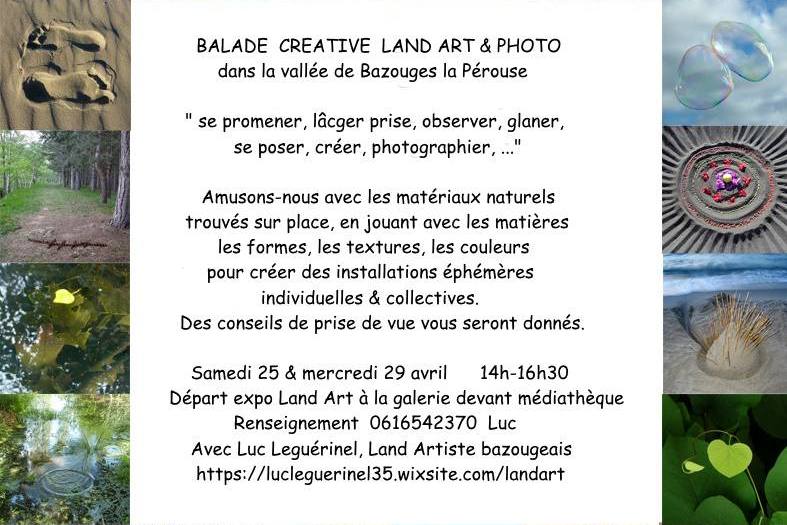 Découvrir sous un autre angle le site naturel d’une vallée boisée avec son torrent sur Bazouges-la-Pérouse au travers du Land Art, un art éphémère : “Se balader, glaner, observer, lâcher prise, se poser, créer, photographier”.