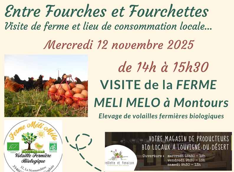 – De 14h à15h30 : La Ferme Méli Mélo, élevage de volailles fermières en Agriculture Biologique à Montours (Les Portes du Coglais)