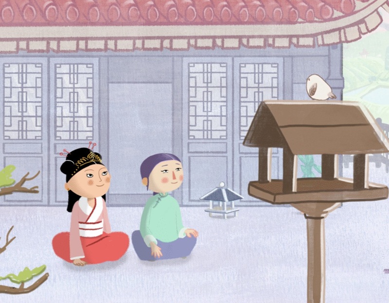 suit un moineau au-delà du temple, une fillette curieuse qui rêve de