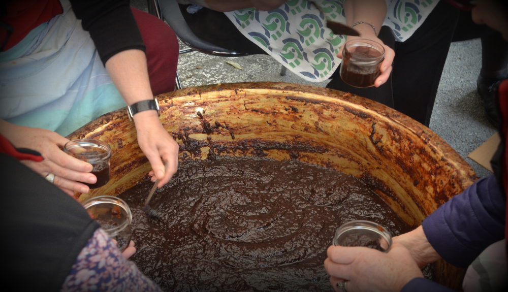 On y prépare le pommé, un genre de confiture à base de pomme et de cidre cuite pendant 24h dans des grandes bassines en cuivres (les pêles en gallo), avant de le mettre en pot.