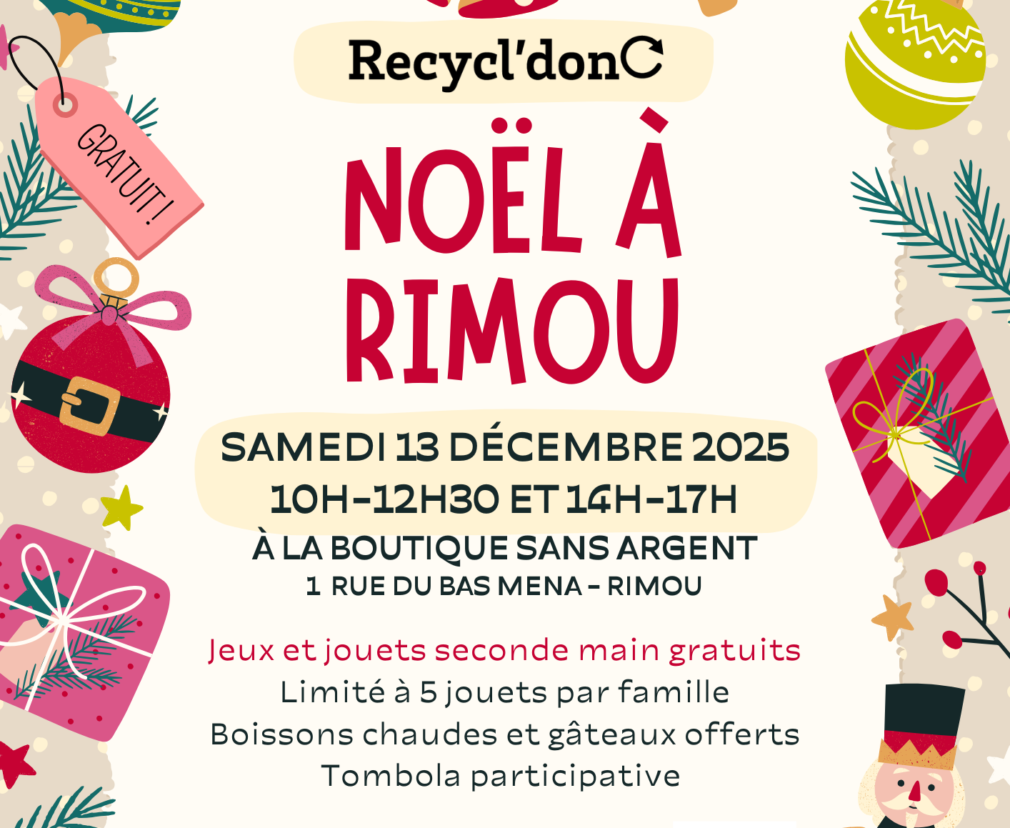 Recycl’donc organise un marché de Noël avec des jeux et des jouets de seconde main gratuits, Limité à 5 jouets par famille. Boissons chaudes et gâteaux offerts avec une tombola participative.