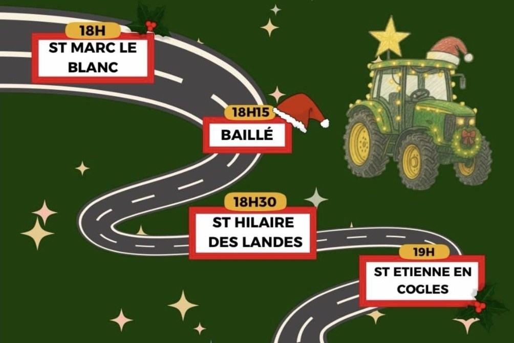 Départ à 18h dans le bourg de Saint-Marc-le-Blanc, puis passage à 18h15 dans le bourg de Baillé, 18h30 dans le bourg de Saint-Hilaire-des-Landes, 19h dans le bourg e Saint-Etienne-en-Coglès et arrivée à 19h30 dans le bourg de Saint-Brice-en-Coglès (à l’occasion du marché de Noël).