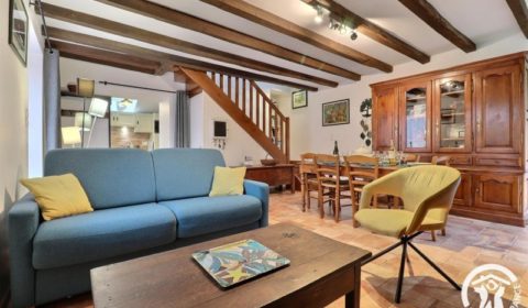 – un séjour avec une salle à manger et un salon avec un poêle à bois et un convertible de qualité pour deux couchages