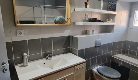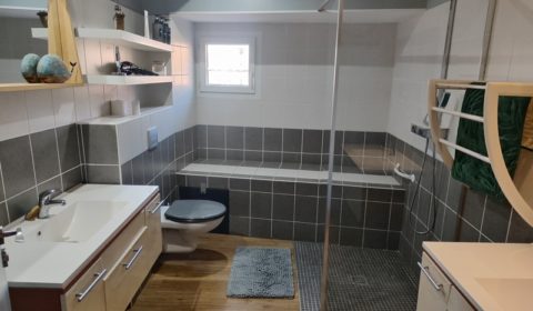 – Au rez-de-chaussée, 3 chambres qui se partagent une vaste salle d’eau commune :