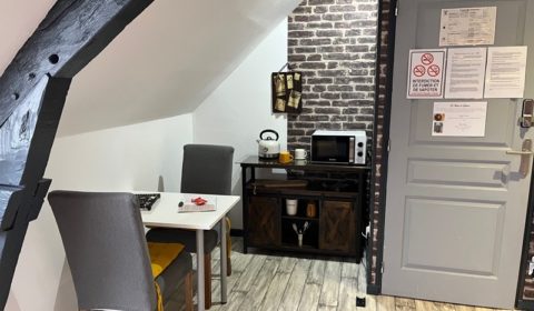 – A l’étage, la grande suite « Loft » équipée d’un lit en 160 par 200 et d’un lit d’appoint en 90 par 190, d’un grand téléviseur, un espace bureau, un espace repas avec bouilloire électrique, micro-onde et vaisselle. Elle peut accueillir un couple ou une famille avec un enfant. Elle dispose aussi d’une grande salle d’eau indépendante avec douche et WC.